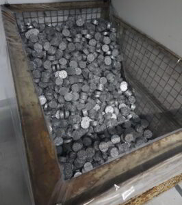 Wenn ausreichend Material im Trichter ist, startet die Presse automatisch. Mit ihrem energieeffizienten 2,2-kW-Motor erzeugt die Anlage einen spezifischen Pressdruck von 1.300 Kilogramm pro Quadratzentimeter. Beim Komprimieren der Späne werden Kühlschmierstoffe nahezu vollständig herausgepresst. Danach liegt die Restfeuchte in den Briketts meist bei etwa drei Prozent. Diese sinkt später noch weiter, da die Briketts nachtrocknen. Die kompakten Alu-Briketts fördert die Formika in eine bereitstehende Box. Jedes zylindrische Brikett hat einen Durchmesser von 60 Millimetern, eine Höhe von 20 Millimetern und eine Masse von rund 110 Gramm. Die Dichte liegt bei etwa zwei Kilogramm pro Kubikdezimeter.