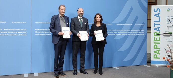 Parlamentarische Staatssekretärin Rita Schwarzelühr-Sutter, Umweltbundesamt-Präsident Prof. Dr. Dirk Messner und Marc Gebauer, Sprecher der Initiative Pro Recyclingpapier (IPR), haben gestern (4. November 2025) im Bundesumweltministerium in Berlin den Recyclingpapier-Report 2025 vorgestellt. Anlässlich ihres 25-jährigen Jubiläums zieht die IPR darin Bilanz: Seit 2000 hat sich der Marktanteil von Büropapier mit dem Blauen Engel in Deutschland von sieben auf 18 Prozent mehr als verdoppelt. Immer mehr Unternehmen und öffentliche Verwaltungen setzen auf Recyclingpapier – und bewirken damit messbare ökologische Einspareffekte.