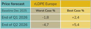 Kurzfristig jedoch bleibt der Markt für rLDPE Regranulaten anfällig. Ausgehend vom Preisniveau Dezember 2025 reicht das Recycario-Szenario – powered by prognostica GmbH – bis Ende Q2 2026 von moderaten Rückgängen im Worst Case*) bis zu einem leichten Anstieg im Best Case*). Dieses Spannungsfeld spiegelt weniger eine Trendwende als vielmehr einen konjunkturell belasteten Übergangszeitraum wider.